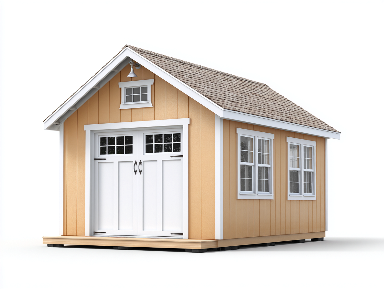 Casetta da giardino progettata per offrire uno spazio ampio e protetto per la conservazione ordinata di attrezzi e accessori per esterni. Il design tradizionale con porta frontale doppia e finestre laterali consente un utilizzo pratico e un'integrazione armoniosa in giardini e cortili residenziali.