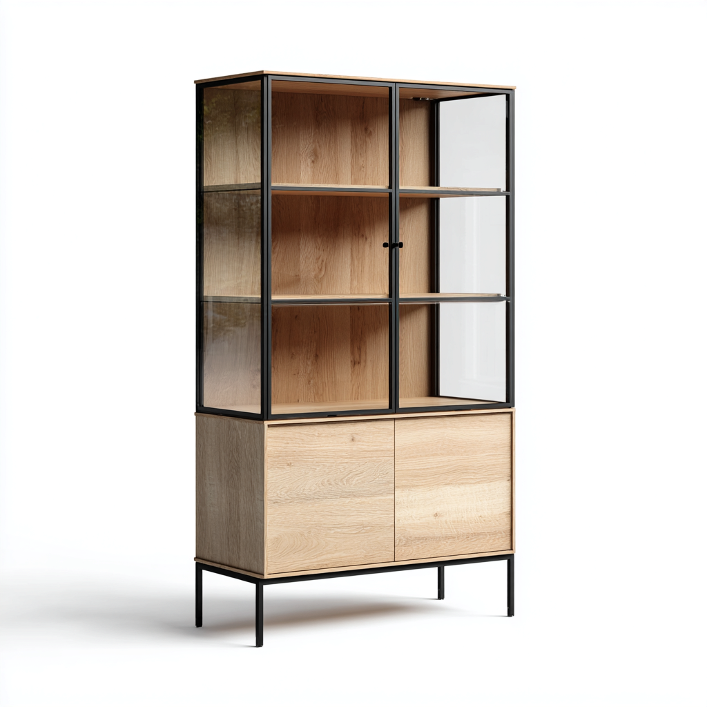 Vetrina dal design moderno caratterizzata da un'estetica equilibrata che combina elementi naturali e industriali. La struttura verticale consente una presentazione ordinata degli oggetti, risultando adatta sia ad ambienti residenziali sia a spazi professionali che richiedono una soluzione funzionale ed elegante.